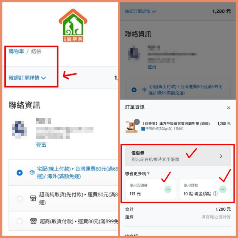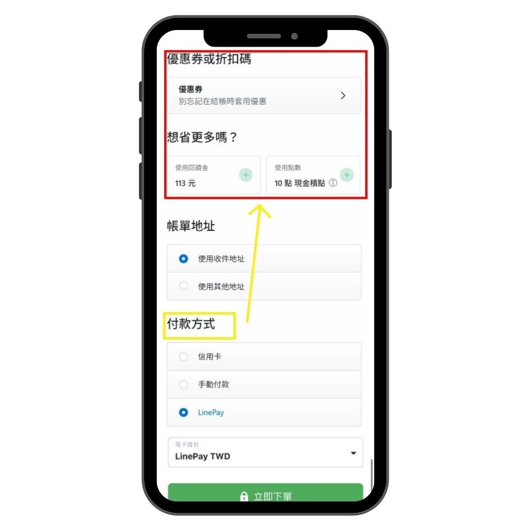 (紅勾) 優惠券(折扣碼)、回饋金、現金積點 自由選擇,可疊加使用